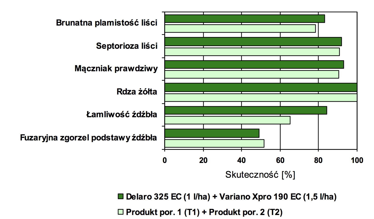 Doskonałą ochronę podstawy źdźbła i liści pszenicy ozimej, zapewnioną przez program oparty na fungicydach Delaro 325 EC i Variano Xpro 190 potwierdzono podczas doświadczenia ścisłego prowadzonego w Chrząstowie w 2016 r. przez Uniwersytet Technologiczno-Przyrodniczy w Bydgoszczy. W ochronie pszenicy ozimej uprawianej po pszenicy do pierwszego zabiegu przeprowadzonego w fazie pierwszego kolanka (BBCH 31) zastosowano Delaro325 EC w dawce 1,0 l/ha. Zabieg fungicydem Variano Xpro 190 EC w dawce 1,5 l/ha wykonano po wykłoszeniu się pszenicy (BBCH 57).