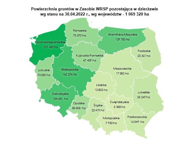 Według stanu na koniec kwietnia 2022 r. do rozdysponowania pozostawało 170 tys. ha nieruchomości Zasobu WRSP. Największymi powierzchniami pozostającymi do rozdysponowania dysponują województwa: zachodniopomorskie, dolnośląskie, lubuskie i wielkopolskie.