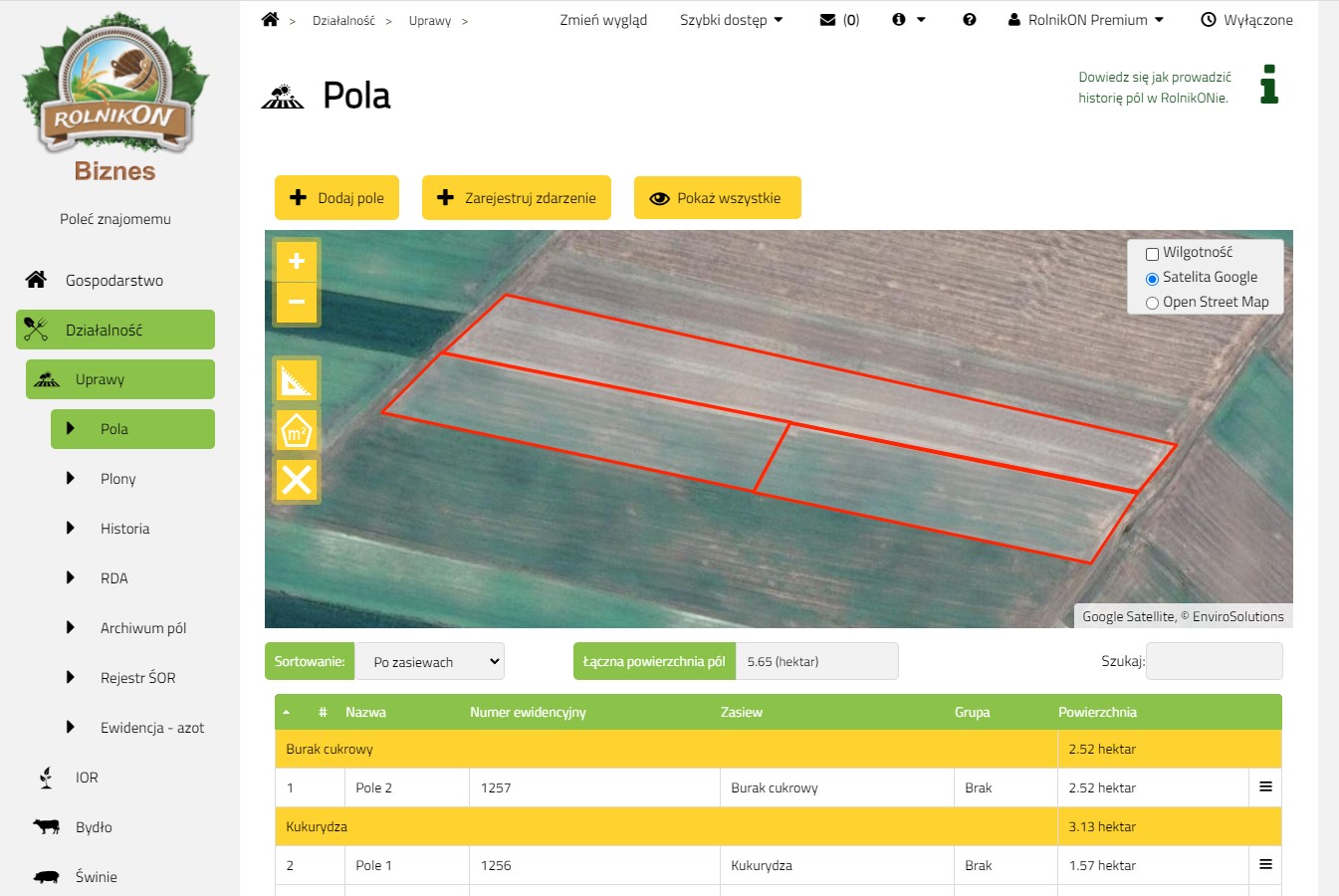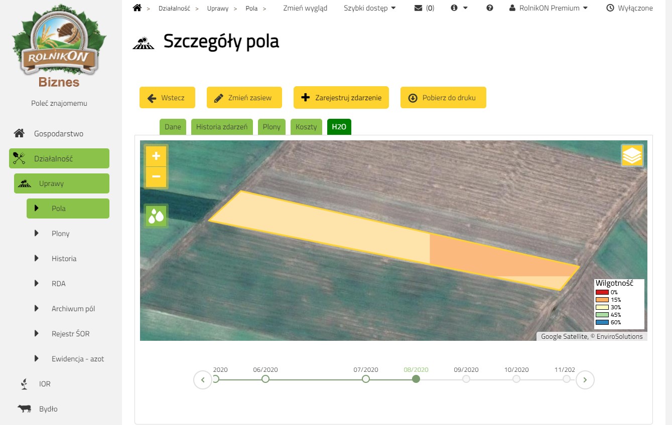 Aby sprawdzić zasobność naszych pól w wodę, należy zarejestrować/zalogować się w systemie www.rolnikon.pl, przejść do zakładki „Działalność”, a następnie „Pola”. Wilgotność można sprawdzić po dodaniu pól, wybierając warstwę dla mapy „Wilgotność”.