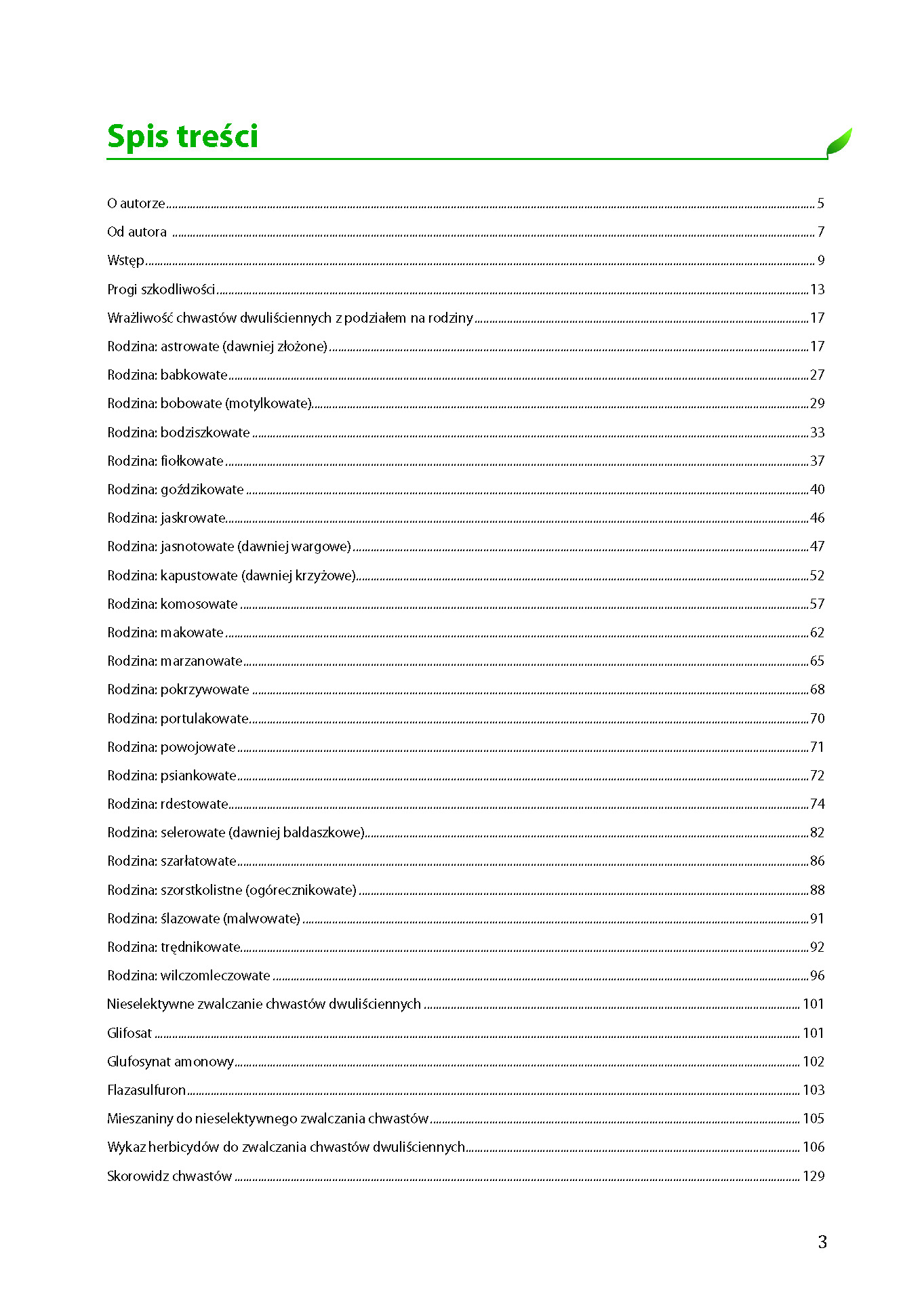 Program zwalczania chwastów podzielono na kilkanaście rodzin, w których opisano dominujące i uciążliwe gatunki w różnego typu uprawach rolniczych. W ramach rodzin obserwuje się różną wrażliwość poszczególnych gatunków chwastów w stosunku do takich samych substancji czynnych. Dlatego też w niektórych opisach rodzin wprowadzono dodatkowe informacje o rozróżnianiu znajdujących się w jej obrębie gatunków. Umiejętność oznaczenia ich w wielu przypadkach pozwoli na dobór odpowiedniej substancji czynnej. Informacje o skuteczności chwastobójczej zestawiono na zasadzie podania optymalnej zalecanej dawki substancji czynnej (w g/ha) w stosunku do gatunku chwastu znajdującego się w fazie największej wrażliwości. W kolejnym zestawieniu tabelarycznym zamieszczono herbicydy oraz zawartość poszczególnych substancji czynnych (w g/l lub kg preparatu), a także zakres podstawowych upraw, w których można je stosować. Pozwoli to na łatwy i szybki wybór herbicydu, a zwłaszcza mieszanin herbicydowych. Skorowidz z nazwami gatunków chwastów ułatwi szybkie ich odnalezienie w opisach poszczególnych rodzin. Szczegółowe zalecenia dla chwastów z poszczególnych rodzin pozwolą na odszukanie substancji czynnej, która zwalcza kilka do kilkunastu gatunków z różnych rodzin. W tym przypadku warto się także posiłkować opisanymi przy rodzinach informacjami o działaniu mieszanin herbicydowych (fabrycznych i zbiornikowych), które wykazują współdziałanie (synergizm) i niejednokrotnie łącznie zwalczają gatunki, na które po zastosowaniu pojedynczo nie wykazują ujemnego wpływu na ich rozwój. To wszystko Czytelnicy znajdą w łatwym do odbioru ujęciu tabelarycznym. Całość została urozmaicona barwnymi zdjęciami chwastów.