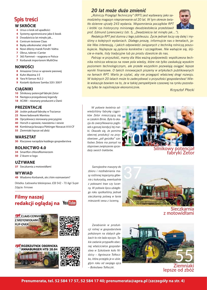 W RPT 5/2019 przeczytacie m.in. o: następcy ciągnik przegubowego Kirowiec, obecnej sytuacji marki Zetor i jej planach na najbliższe lata, nowych ładowarkach Manitou, smartfonie używanym do przygotowania mapy pogłownego nawożenia azotowego,  rozwiązaniach koncernu CNH wpisujących się w ramy Rolnictwa 4.0 oraz o rodzajach kluczy od płasko-oczkowych do typu Torx. Zapraszamy do lektury i prenumeraty poprzez płatność elektroniczną