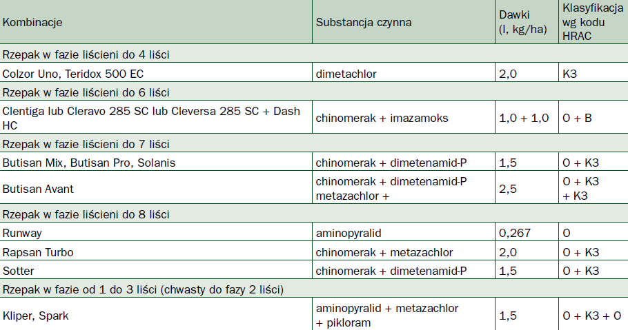 Głębokość siewu rzepaku i wilgotność gleby wpływają na termin jego wschodów. Chwasty radzą sobie lepiej nawet w niekorzystnych warunkach, ponadto ich nasiona znajdują się na różnej głębokości. Bywa, że w momencie, gdy pojawiają się siewki rzepaku, chwasty znajdują się w bardziej zaawansowanych fazach rozwojowych. To okres, w którym można wykorzystać herbicydy nie zalecane do zabiegów doglebowych. Należą do nich środki zawierające dimetachlor (Colzor Uno i Teridox 500 SC) oraz cały szereg mieszanin fabrycznych zawierających w składzie w różnych wariantach i proporcjach: chinomerak, dimetenamid-P i metazachlor. Do selektywnych herbicydów w stosunku do młodego rzepaku należy także aminopyralid (Runway). Omawiane herbicydy można także stosować później, w zależności od produktu w fazie 4-8 liści rzepaku.